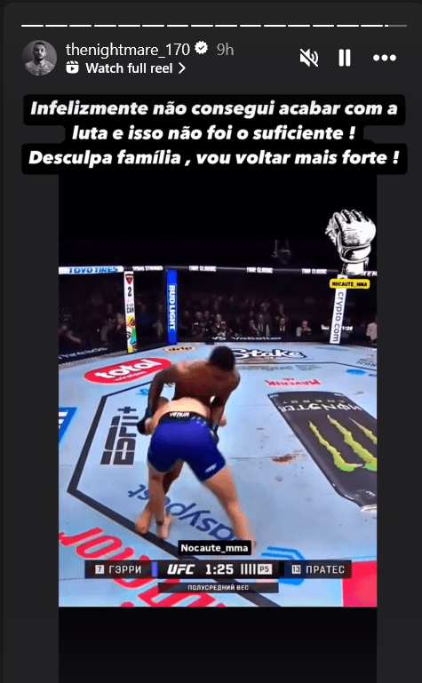 Gutted by the defeat, Prates turned to Instagram Stories to concisely share his disappointment about not being able to finish the fight the way he had envisioned.