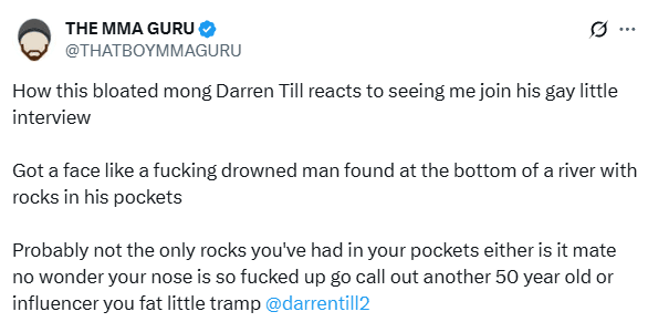 How this bloated mong Darren Till reacts to seeing me join his gay little interview," The MMA Guru wrote in response. "Got a face like a f*cking drowned man found at the bottom of a river with rocks in his pockets. Probably not the only rocks you've had in your pockets either is it mate no wonder your nose is so f*cked up go call out another 50 year old or influencer you fat little tramp."
