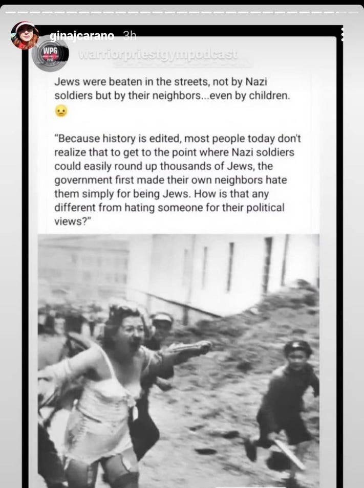Jews were beaten in the streets, not by Nazi soldiers but by their neighbors…. even by children, because history is edited, most people today don’t realize that to get to the point where Nazi soldiers could easily round up thousands of Jews, the government first made their own neighbors hate them simply for being Jews," the actress posted at the time. "How is that any different from hating someone for their political views?