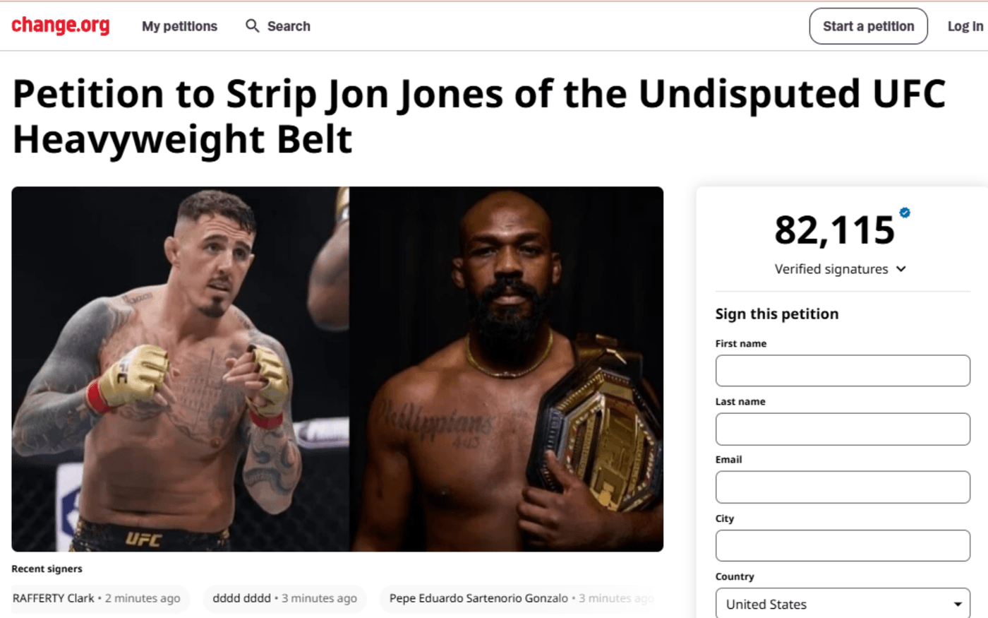 Frustrated by Jon Jones' seemingly nonchalant attitude toward a potential heavyweight title unification bout with Tom Aspinall, fans launched a petition on Change.org two weeks ago, urging UFC CEO Dana White to take action and strip “Bones” of his title over his ongoing unwillingness to face the interim champion.