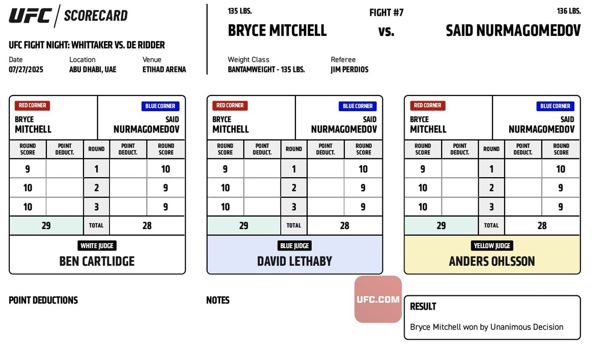 In the second and third rounds, Mitchell leaned heavily on his wrestling, scoring timely takedowns and controlling key positions. He ended the final round in back control, sealing the deal with all three judges scoring the bout 29-28 in his favor.