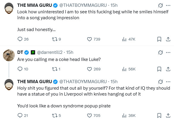 How this bloated mong Darren Till reacts to seeing me join his gay little interview," The MMA Guru wrote in response. "Got a face like a f*cking drowned man found at the bottom of a river with rocks in his pockets. Probably not the only rocks you've had in your pockets either is it mate no wonder your nose is so f*cked up go call out another 50 year old or influencer you fat little tramp."
