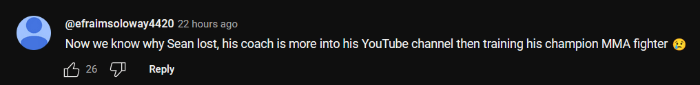 "Now we know why Sean lost; his coach is more into his YouTube channel than training his champion MMA fighter"