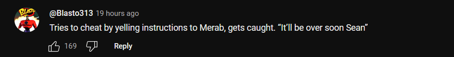 "Tries to cheat by yelling instructions to Merab, gets caught. 'It’ll be over soon, Sean'."