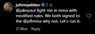 Underneath the clip posted by MMA Fighting on Instagram, one of the top names on the PFL roster called for a modified rules fight with Paul seeing that he can't get Diaz to step in there with him. Bellator middleweight champion Johnny Eblen has won back-to-back fights this year, improving his overall record to 16-0.
