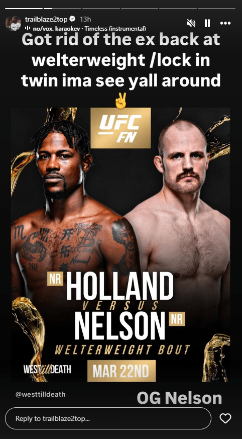Holland confirmed the fight on Instagram by reposting a graphic of the matchup. In his caption, he wrote, “Got rid of the ex, back at Welterweight/lock in twin. Imma see you around.”