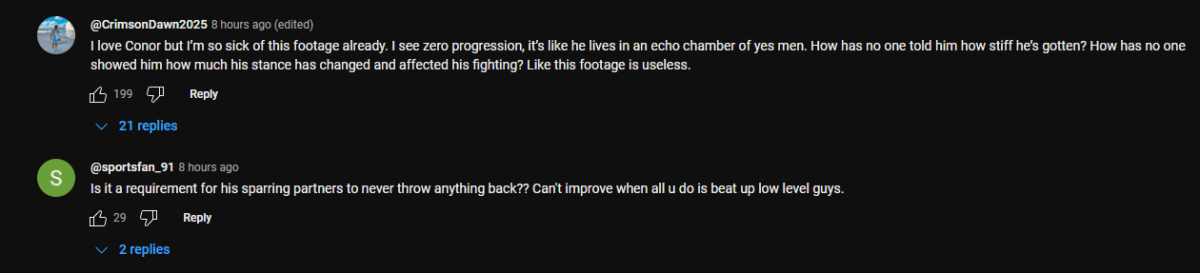 "I love Conor but I’m so sick of this footage already. I see zero progression, it’s like he lives in an echo chamber of yes men. How has no one told him how stiff he’s gotten? How has no one showed him how much his stance has changed and affected his fighting? Like this footage is useless."