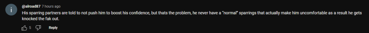"His sparring partners are told to not push him to boost his confidence, but thats the problem, he never have a 'normal' sparrings that actually make him uncomfortable as a result he gets knocked the fak out."